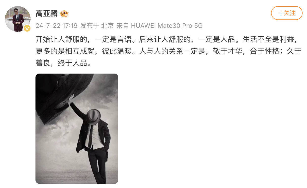 7月22日,高亚麟自被曝在妻子孕期出轨以来首次公开发文:“开始让人舒服的,一定是言语。后来让人舒服的,一定是人品。生活不全是利益,更多的是相互成就,彼此温暖。人与人的关系一定是,敬于才华,合于性格;久于善良,终于人品。”高亚麟大谈人品,未对出轨事件作出正面回应。