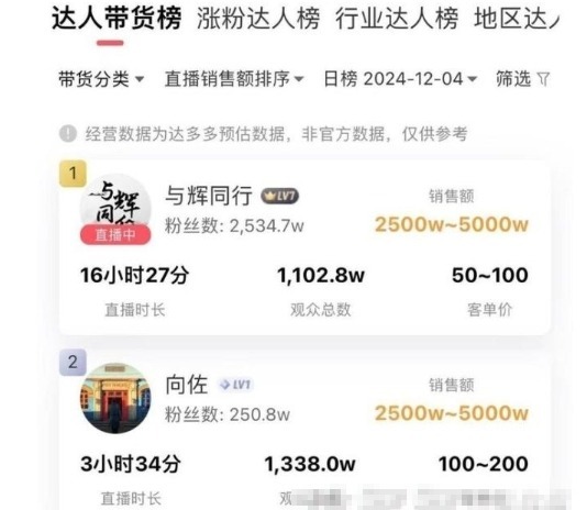 向佐直播业务关联方为上海奕双耳多全实业集团有限公司,该公司由向佐持股51%,成立于2023年7月。在这次抖音首播中,向佐与海旅免税集团合作,在三亚海旅免税城现场带货美妆大牌产品,其浓妆女装造型引起关注。数据显示,向佐两日直播仅带货46款商品,其中销售额最高的产品为雅诗兰黛精华、赫莲娜面霜等。两天内,向佐涨粉28.5万,粉丝总量增长至250.8万。