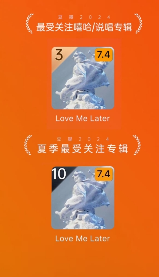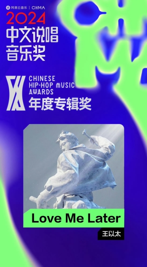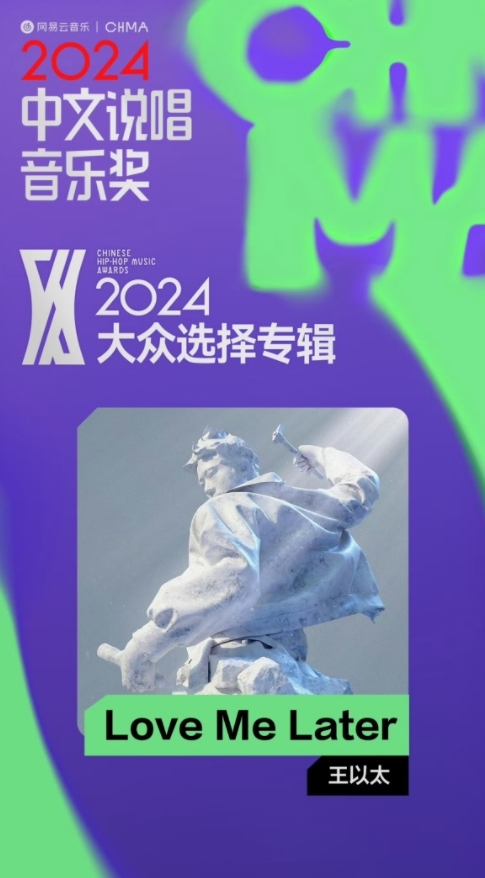 正因如此,《Love Me Later》所获得的荣誉——从专业领域的融合嘻哈盛典“最佳华语说唱专辑”,到市场层面的网易云音乐“年度专辑奖”与“大众选择专辑奖”,再到文化媒体豆瓣年度音乐榜单“最受关注嘻哈/说唱专辑”及“夏季最受关注专辑”——实质上是从不同维度印证了同一事实:这是一张在艺术表达与公众共鸣间取得精妙平衡的作品,它既经得起专业审听,也触达了广泛人群,成为2024年华语说唱中一部兼具人格深度与传播宽度的代表性专辑。