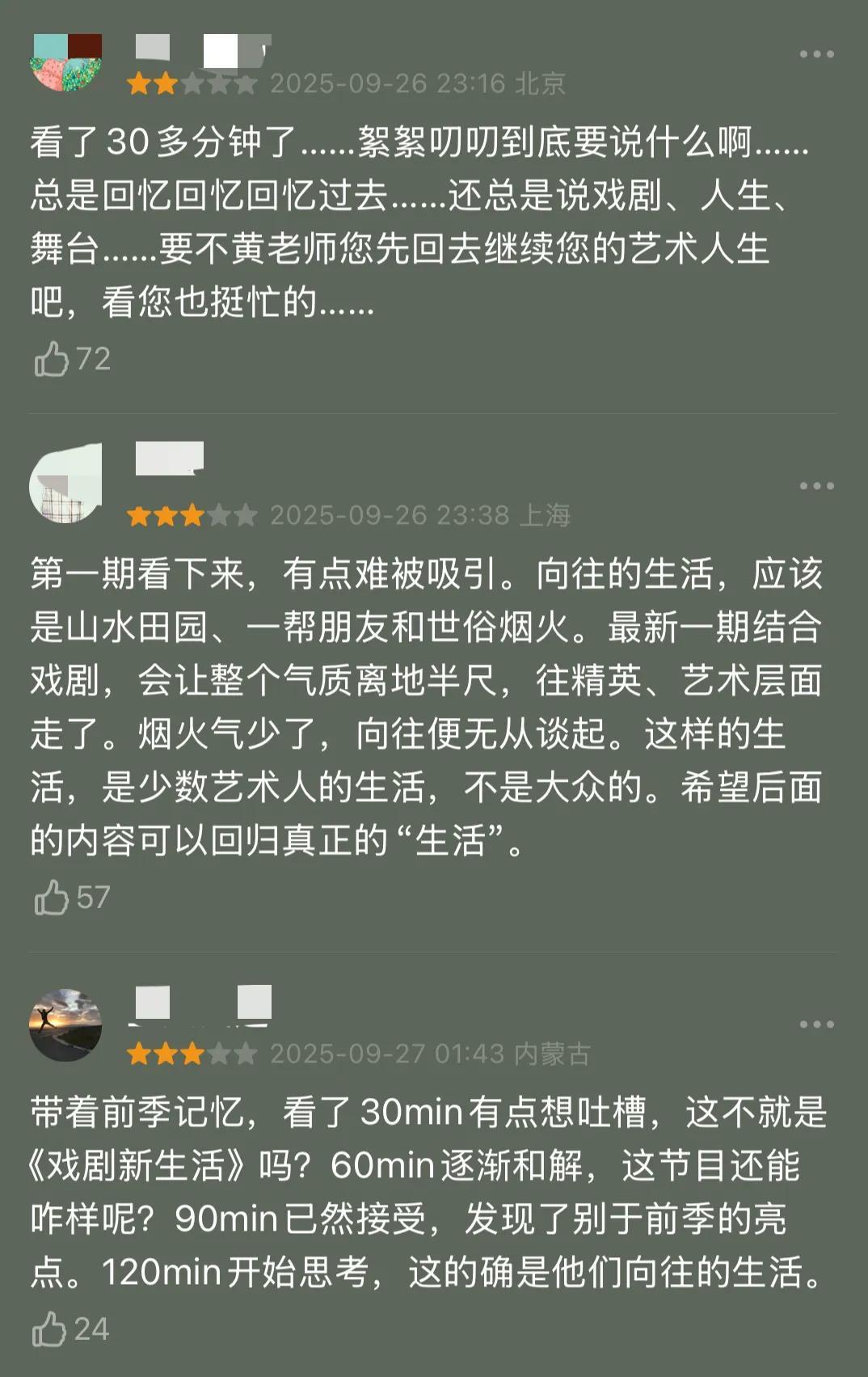 原本向往的生活定位是乡村、朋友、悠闲,现在变成了戏剧、同事、工作,还不如直接改名叫《向往的戏剧》。