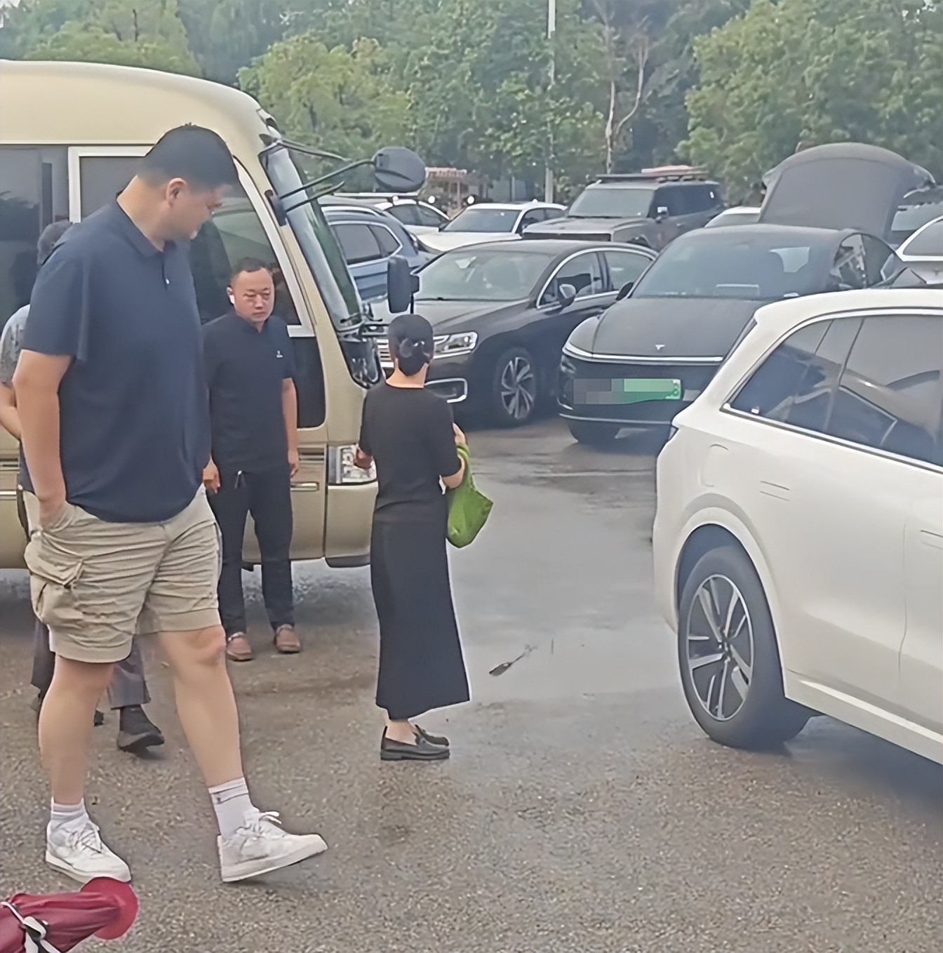 他的妻子叶莉也是一身休闲装扮,身高1米9的叶莉站在姚明身边,瞬间显得小鸟依人。