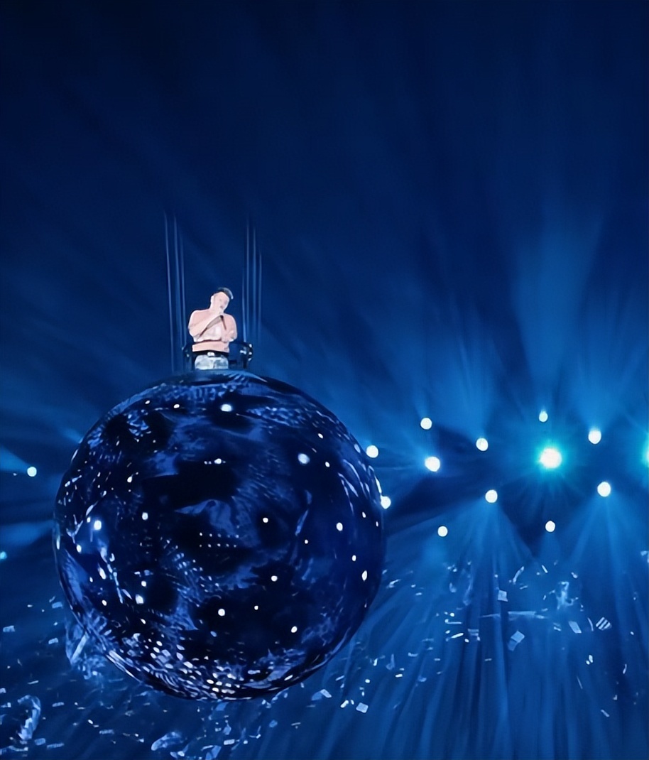 其中有一个场景是以蓝色为主题,他站在一个大圆球上,在空中演唱,特别有氛围感。