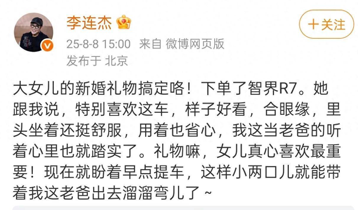 所以不少网友猜测,李连杰送大女儿这样的新婚礼物是不是因为偏心,不过在了解之后才知道,李连杰是真的抠,再加上大女儿也确实喜欢这份礼物。