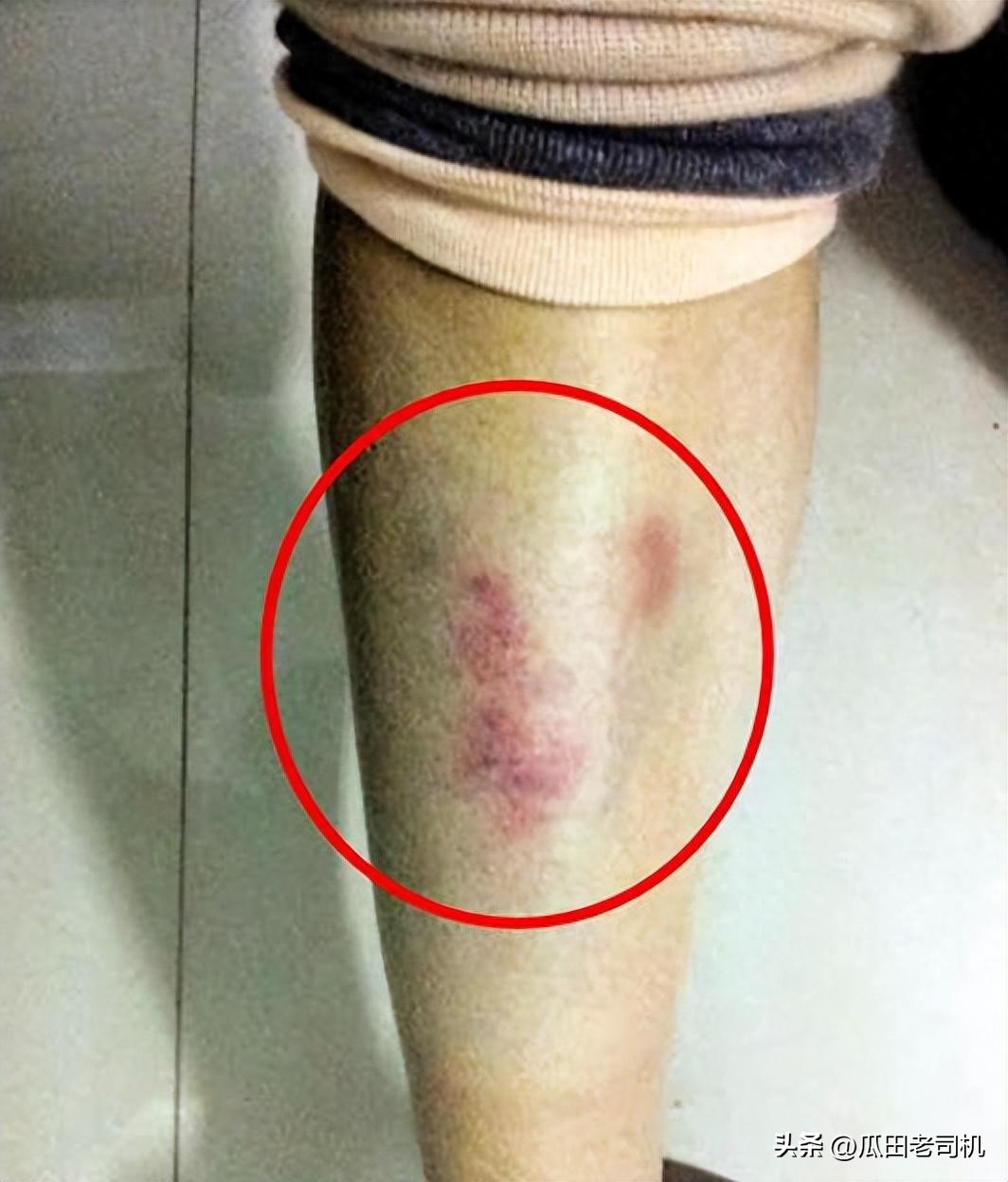 她被打的一身伤,打成脑震荡,视力模糊,大量呕吐,腿更是一堆红肿淤青。
