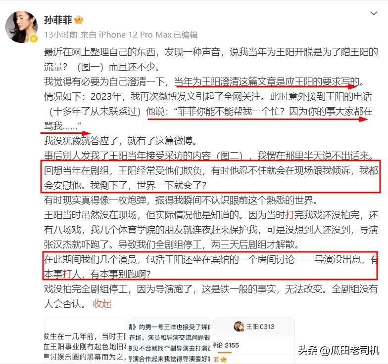 于是孙菲菲就把王阳找他打电话让孙菲菲帮他澄清的事情爆了出来。