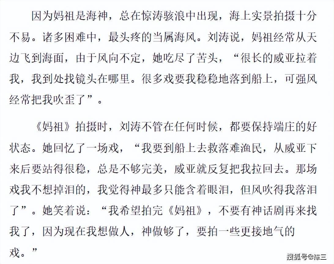 甚至为了呈现出真实的海上场景,刘涛常常要在海上吊着威亚进行拍摄。